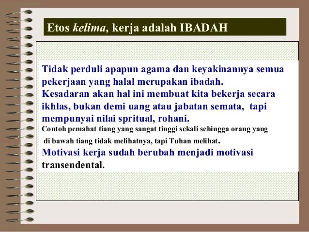 Motivasi kerja dalam islam bukanlah untuk mengejar hidup hedonis bukan juga untuk status apa lagi untuk mengejar kekayaan dengan segala cara. Motivasi kerja dalam islam bukanlah untuk mengejar hidup hedonis bukan juga untuk status apa lagi untuk mengejar kekayaan dengan segala cara. Ikhlas akan berusaha memberikan sumbangsih terbaiknya bagi perusahaan tempat ia bekerja karena didukung semangat bahwa kerja adalah ibadah sedangkan ibadah yang diterima allah adalah yang berkualitas.